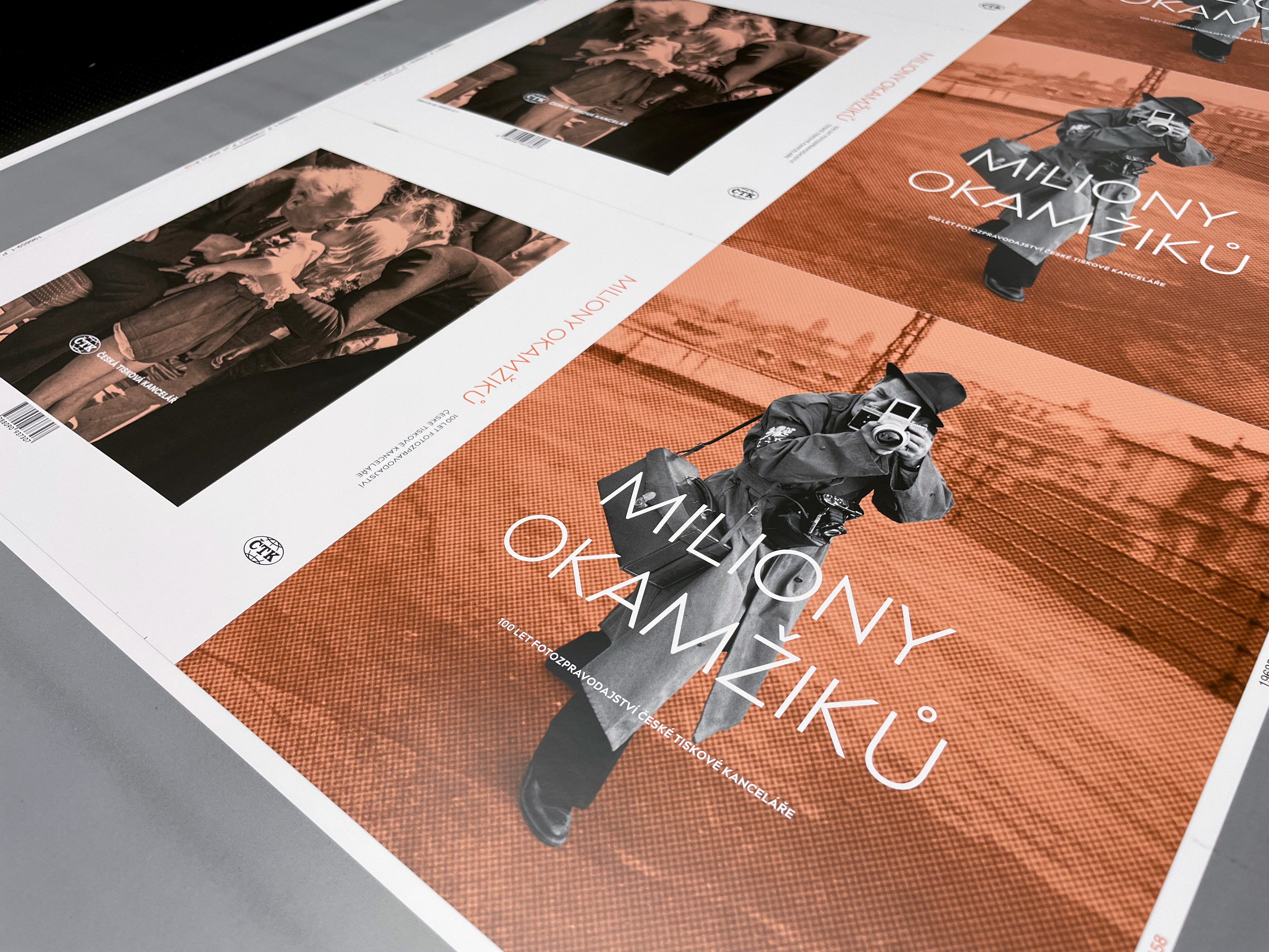 K příležitosti stého výročí založení obrazového zpravodajství České tiskové kanceláře vyšla kniha Miliony okamžiků. Byla jsem oslovena, abych tuto knihu navrhla a spolu s ní i výstavu fotografií. Pro koncept knihy jsem zvolila dva úhly pohledu – jeden na samotného fotoreportéra a druhý na jeho objekt v hledáčku. Na obálce je fotoreportér ČTK Josef Mucha, který mimo jiné zachytil ve 40. let minulého století moment z otevření školky v pražské Tróji (zadní obálka), fotbalové utkání na pražské Spartě nebo rekreační pobyt mládeže (předsádky). Publikace mapuje vývoj agenturního fotozpravodajství od roku 1924 až po současnost. Fotografickou publikaci je možné zakoupit online ve Vydavatelství Univerzity Palackého, osobně pak v galerii Czech Photo Centre nebo na recepci ČTK v Opletalově ulici.