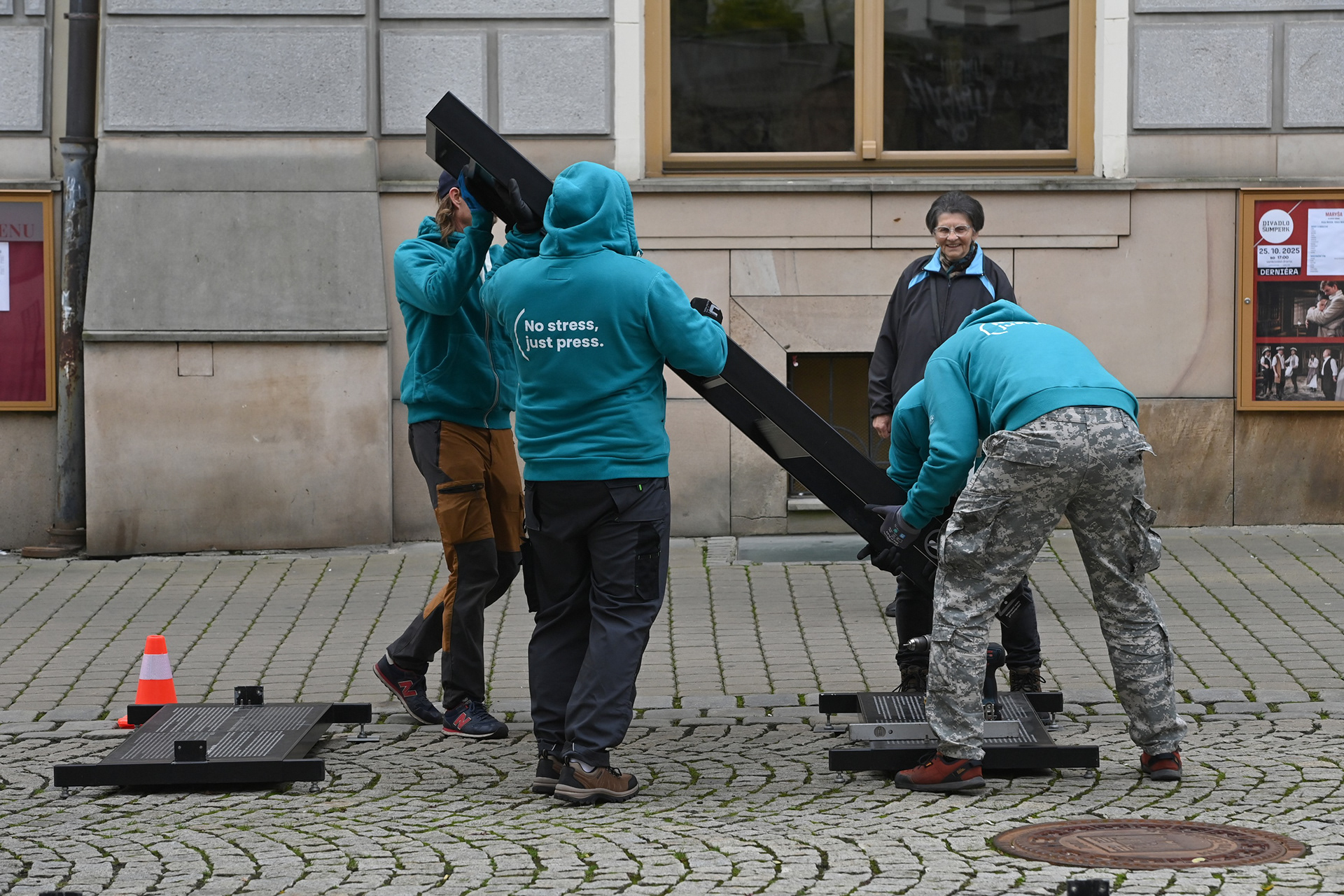 Installation of the exhibition in Šumperk. We also designed the look of work sweatshirts ./ Instalace výstavy v Šumperku. Navrhovali jsme taktéž vzhled pracovních mikin. Foto: Peřina Luděk, ČTK