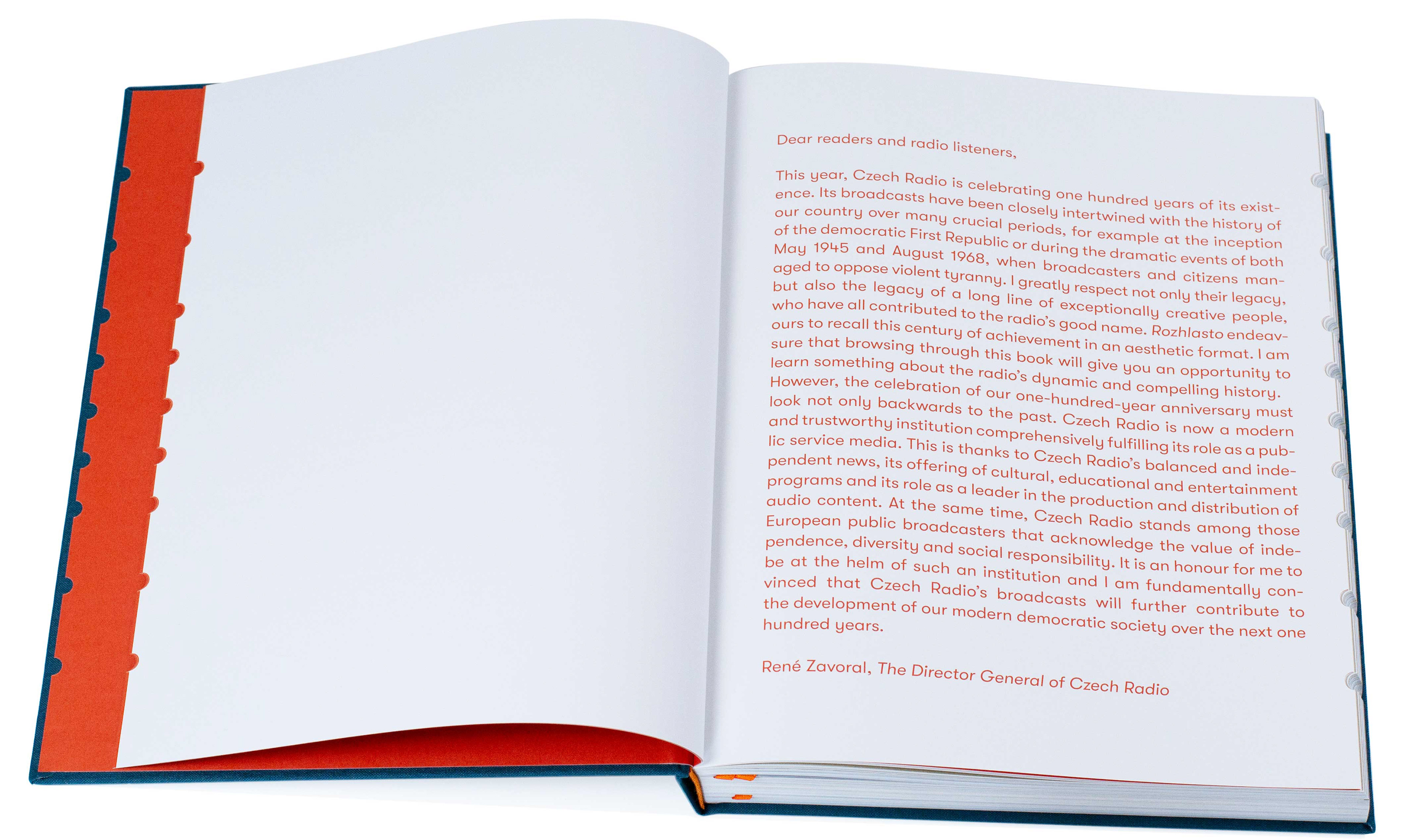 Vytvořili jsme koncept a design jubilejní knihy pro Český rozhlas. Knihu jsme pojali jako akustický objekt na vstřebání stoletých dějin rozhlasového vysílání. Rozmanitá historie je podpořena barevným zpracováním jednotlivých kapitol. Navrtání přední části bloku evokuje rozhlasové vlny a akustické materiály. V knize naleznete několik tajemných, zavřených složek. Je na každém čtenáři jestli do nich chce nahlédnout. Velký dík patří pracovní skupině rozhlasu za důvěru, kterou jsme dostali a tiskárně HRG za jejich odvahu a precizní zpracování.